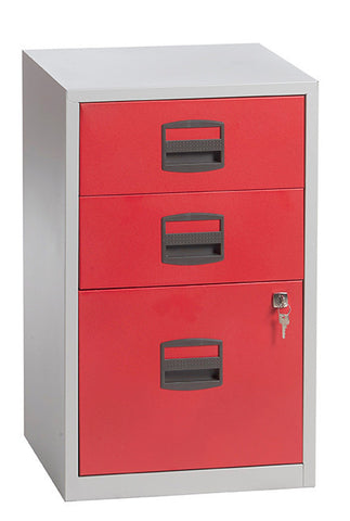 Bisley PFA Home Filer with one filing drawer and two stationery drawers. Filing drawer holds A4 files only